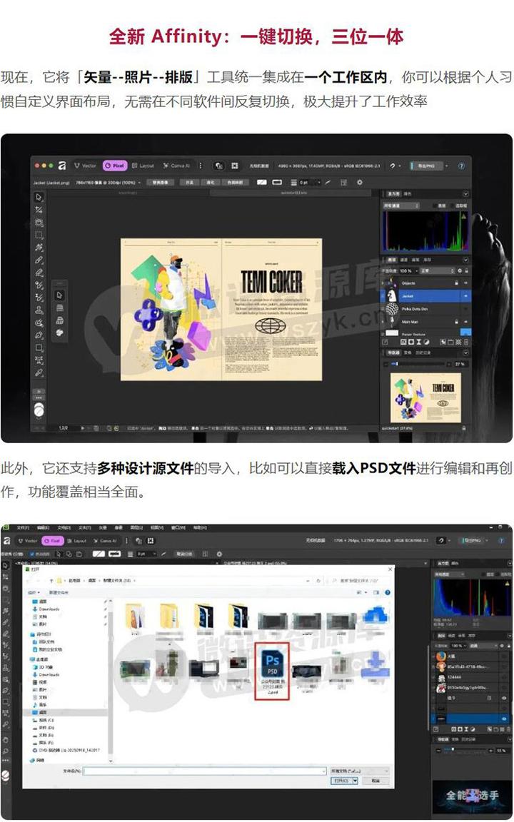 全新版本的Affinity 核心亮点十足,将此前独立的三款专业软件 「 Affinity Photo(图像编辑) 」– 「 Affinity Designer(矢量设计) 」– 「Affinity Publisher(排版设计) 」 全面整合至单一应用程序中