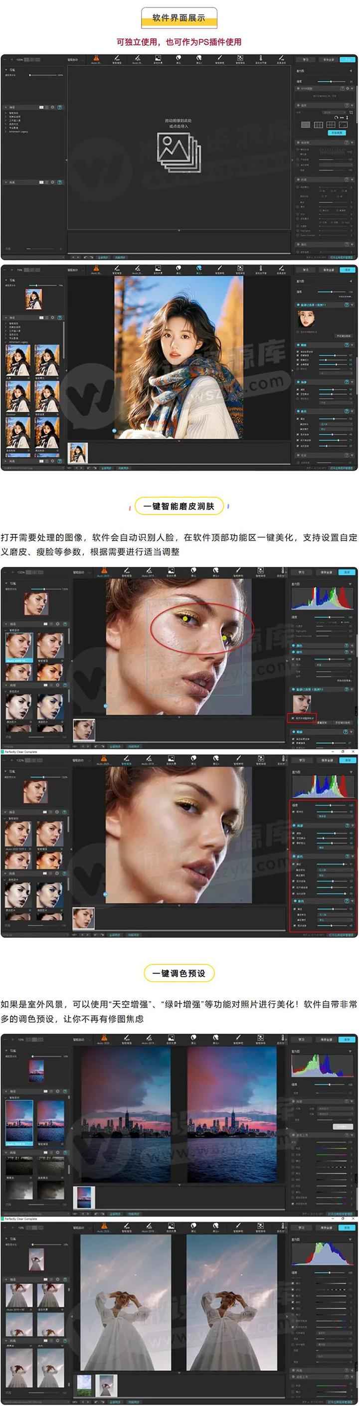 本期微设资源库带来一款功能强大的傻瓜式AI修图神器,使用它可以快速批量解决一些常见的图片处理问题,如磨皮润肤、消除红眼、智能降噪等人像操作、风景智能美化、一键胶片滤镜效果等,大大提升后期效率!